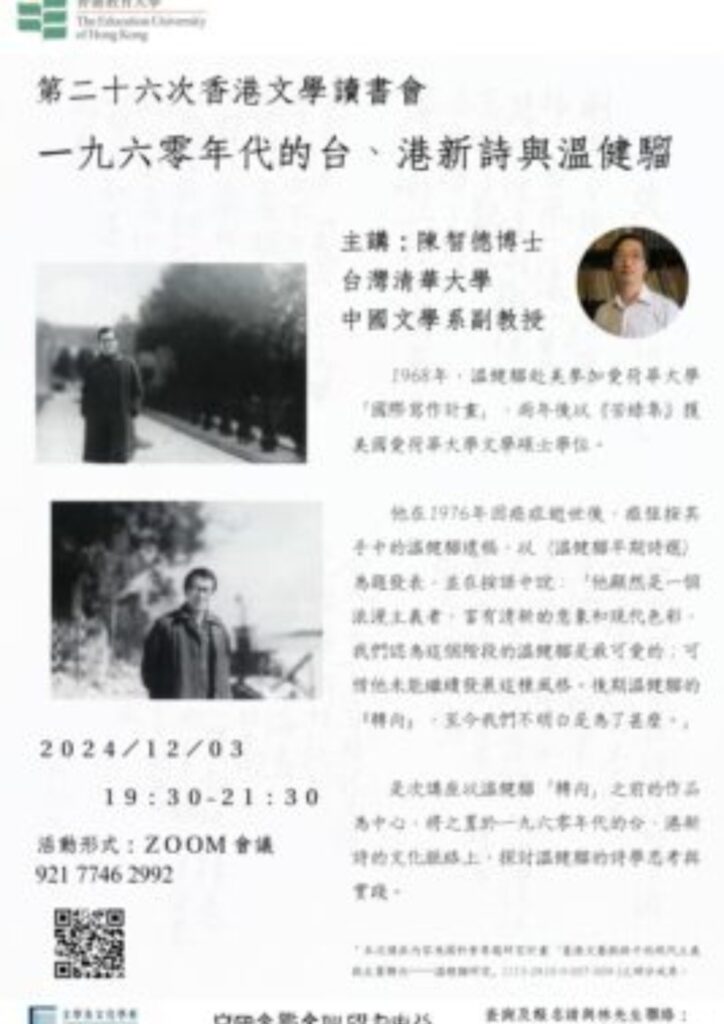 是次講座以溫健騮「轉向」之前的作品為中心,將之置於一九六○年代的台、港新詩的文化脈絡上,探討溫健騮的詩學思考與實踐。