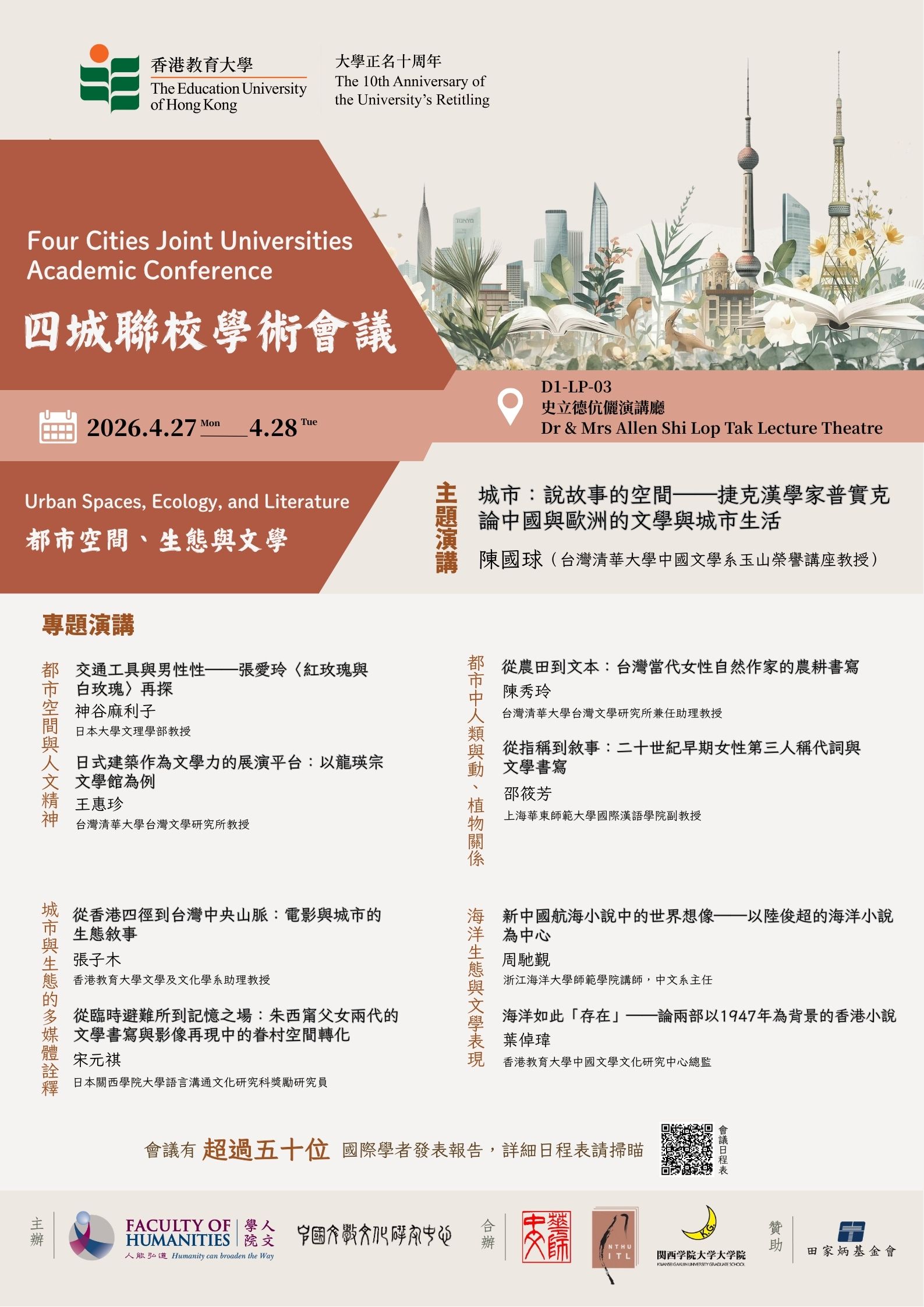 為推動文學、文化及城市研究,香港教育大學中國文學文化研究中心聯同上海華東師範大學中國語言文學系、台灣清華大學台灣文學研究所、日本關西學院大學法學部合辦「四城聯校學術會議:都市空間、生態與文學」。會議將於2026年 4月27–28日假香港教育大學(大埔校園)舉行。